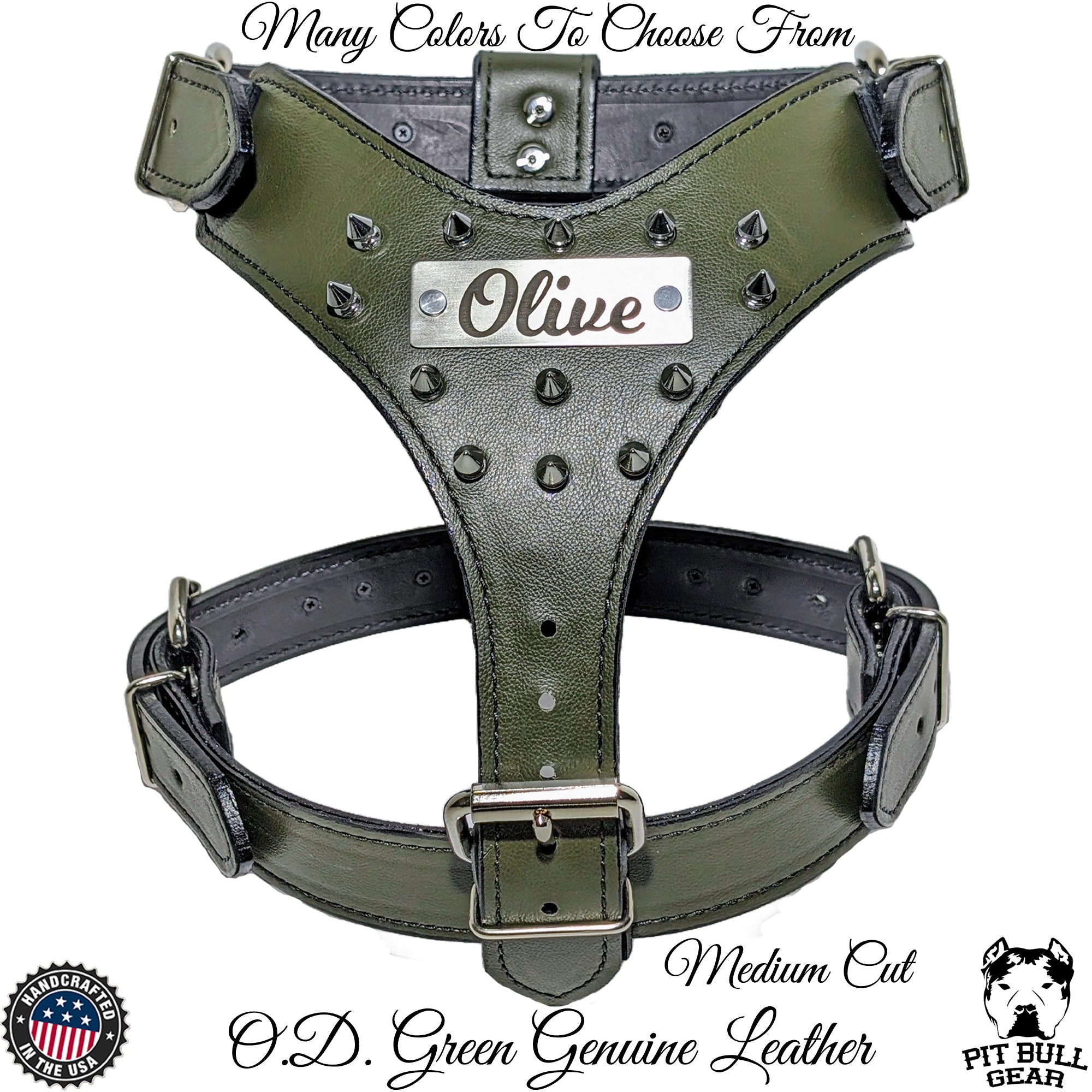 This custom-made leather dog harness combines style, durability, and a little edge with its 1/2" spikes and personalized engraved name plate. Perfect for strong, active dogs, this harness is handcrafted from premium leather, ensuring both comfort and long-lasting wear. The spikes give it a bold, standout look, while the custom engraved name plate adds a unique touch, allowing you to personalize it with your dog’s name or essential contact info.