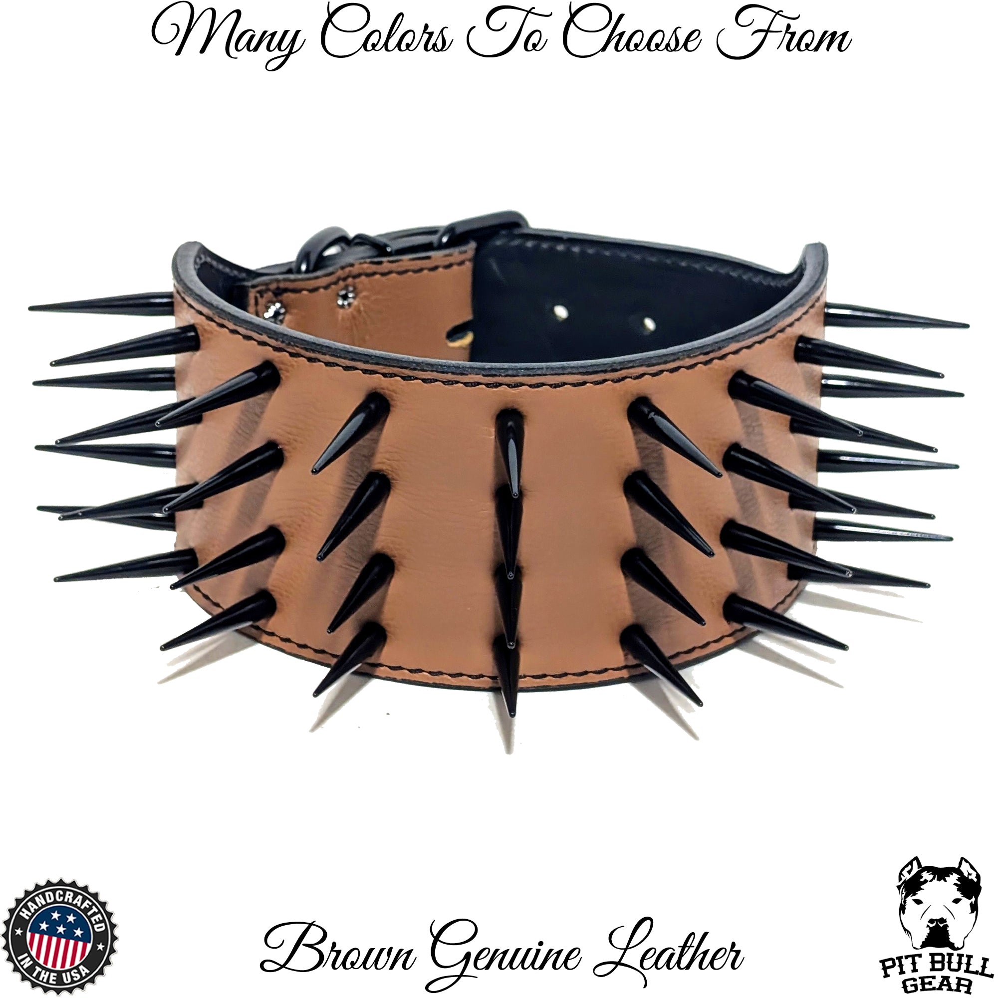 Custom Made 2.5" Wide Leather Spiked Dog Collar – Built for strength and attitude. This heavy-duty collar features four rows of 1.5" silver cone spikes and is handcrafted from premium leather. Choose your leather color, spike color, and hardware finish for a fully customized look. Perfect for large, powerful breeds like Pit Bulls, Cane Corsos, and Mastiffs.