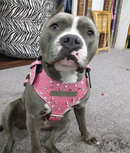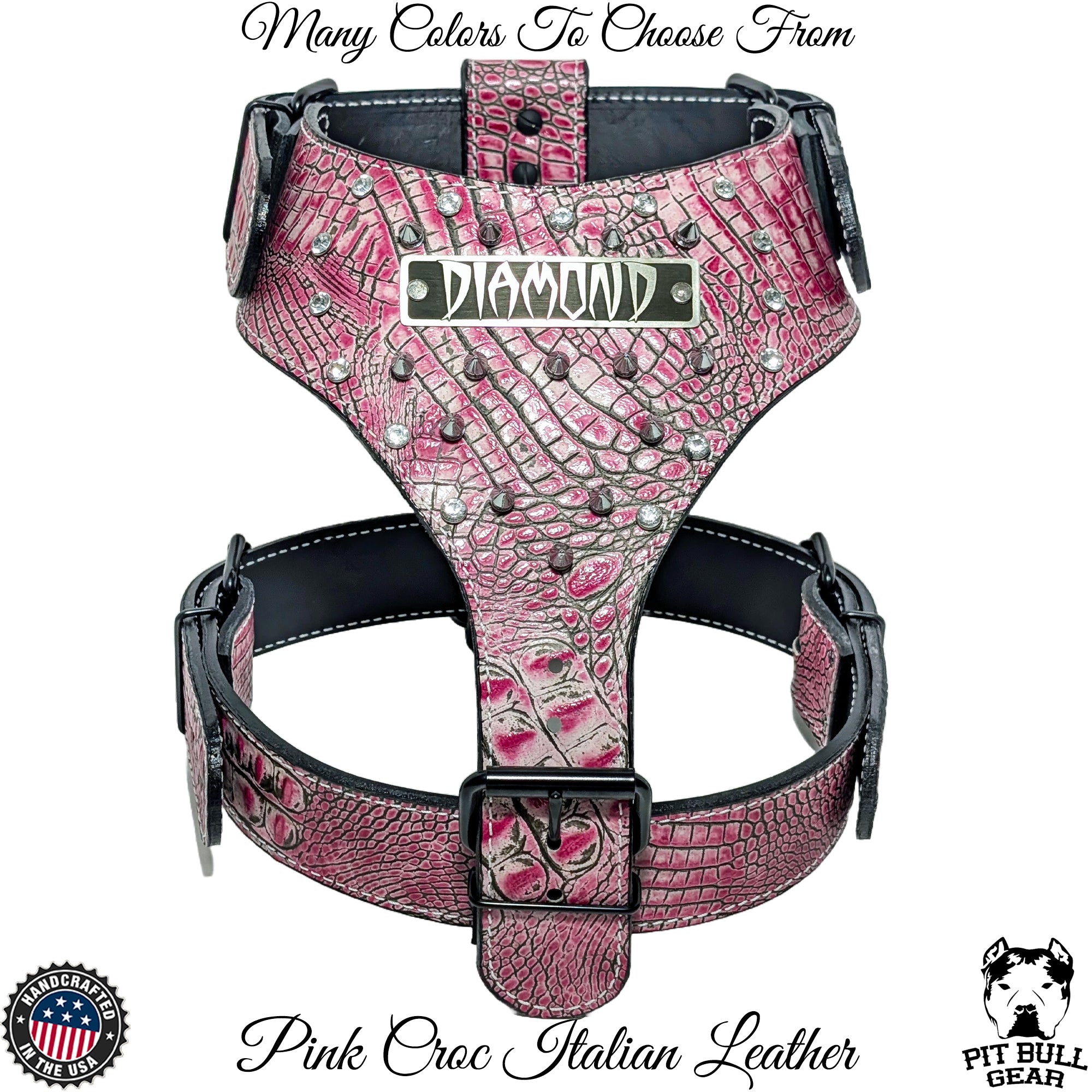 Unleash your dog's power and elegance with this handcrafted leather harness, featuring bold 1/2" tree spikes and shimmering crystal gems for a striking combination of strength and style. Finished with a custom-engraved name plate, this harness is built for durability and designed to turn heads. Perfect for strong, confident dogs who deserve the best.