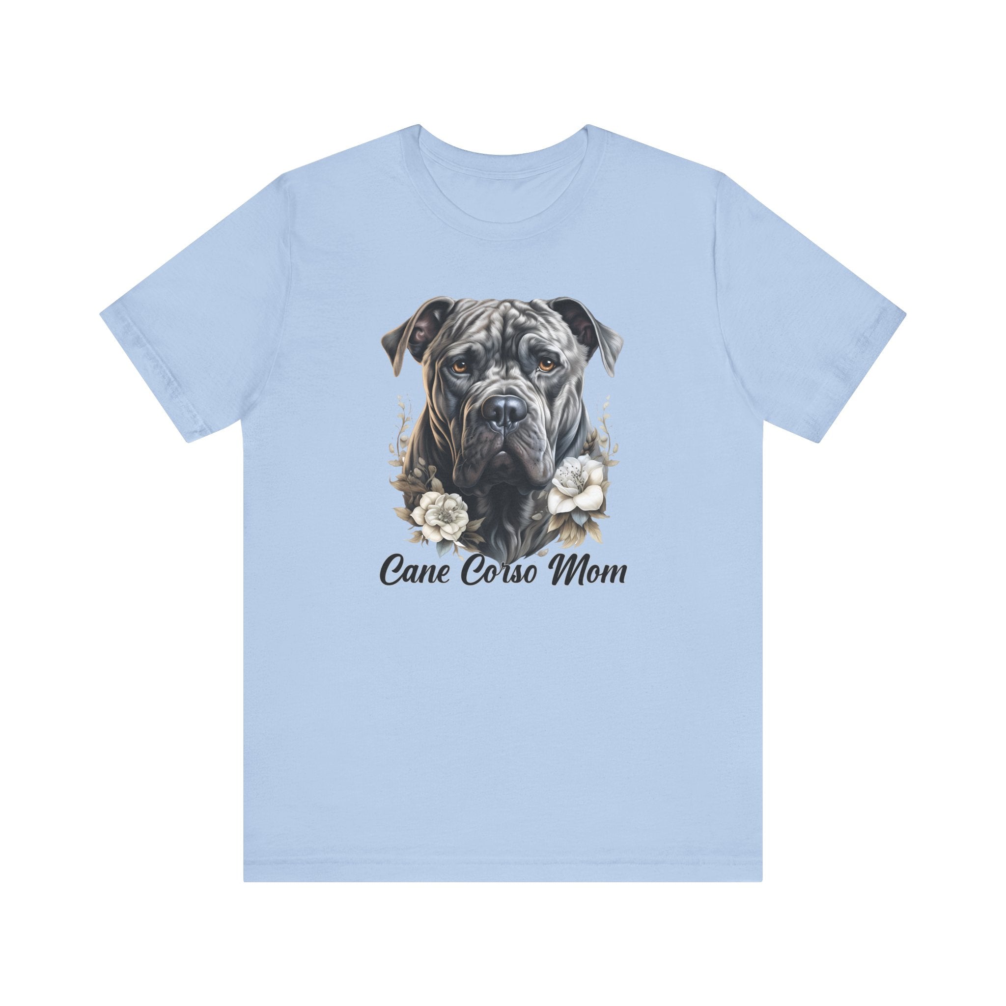 Celebrate your love for Cane Corsos with this charming illustrated design featuring a Cane Corso Head with flower accents and "Cane Corso Mom" written underneath. Printed on a soft and durable Bella Canvas 3001 Unisex T-Shirt using direct-to-garment printing, this tee combines comfort, style, and lasting quality—perfect for proud Cane Corso moms!