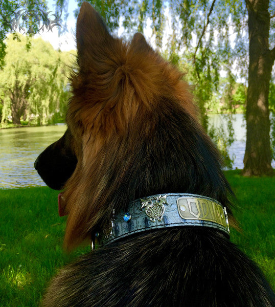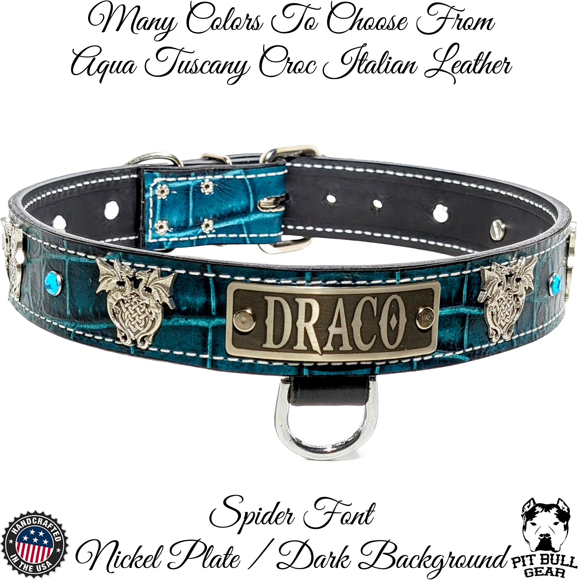 Consiente a tu peludo amigo con una opulencia regia con nuestro collar de cuero para perros V30 de 1,5" de ancho hecho a medida. Fabricado con cuero de primera calidad, este collar irradia durabilidad y lujo. Cada collar está adornado meticulosamente con exquisitos conchos de dragón, que evocan una sensación de misticismo y poder. Las brillantes gemas de cristal acentúan el collar, agregando un toque de glamour y sofisticación.
