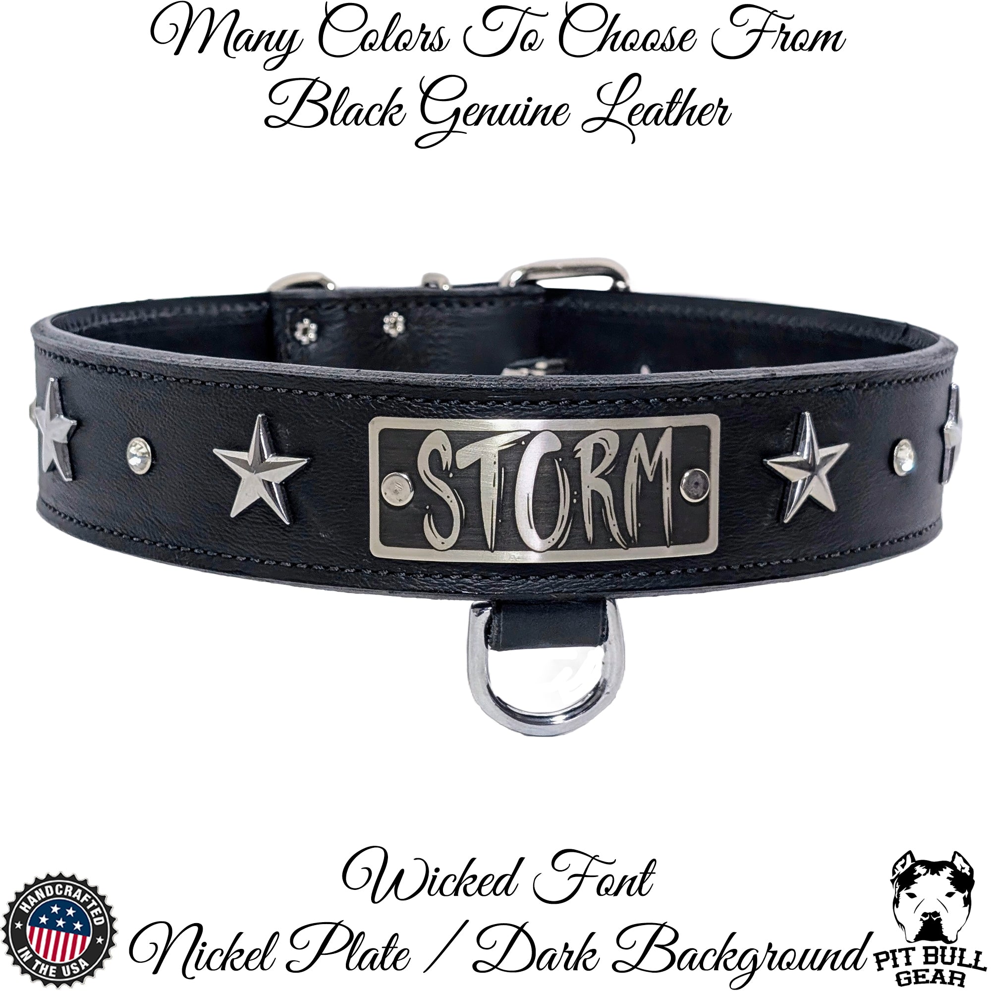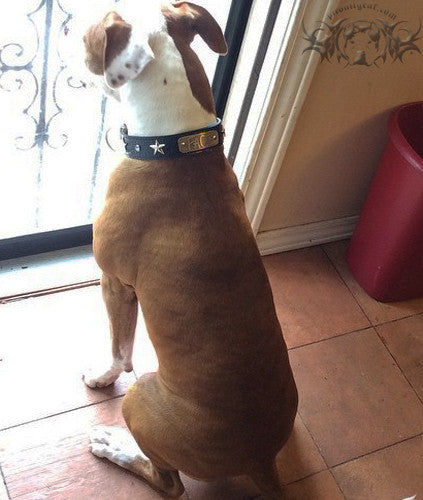 Realza el estilo de tu perro con este impresionante collar de cuero para perros de 1,5" de ancho hecho a medida, adornado con llamativos conchos de estrella y brillantes diamantes de imitación con remaches de cristal. Fabricado a mano con cuero de primera calidad, este collar combina durabilidad resistente con elegancia, lo que lo hace perfecto para perros que aman brillar.