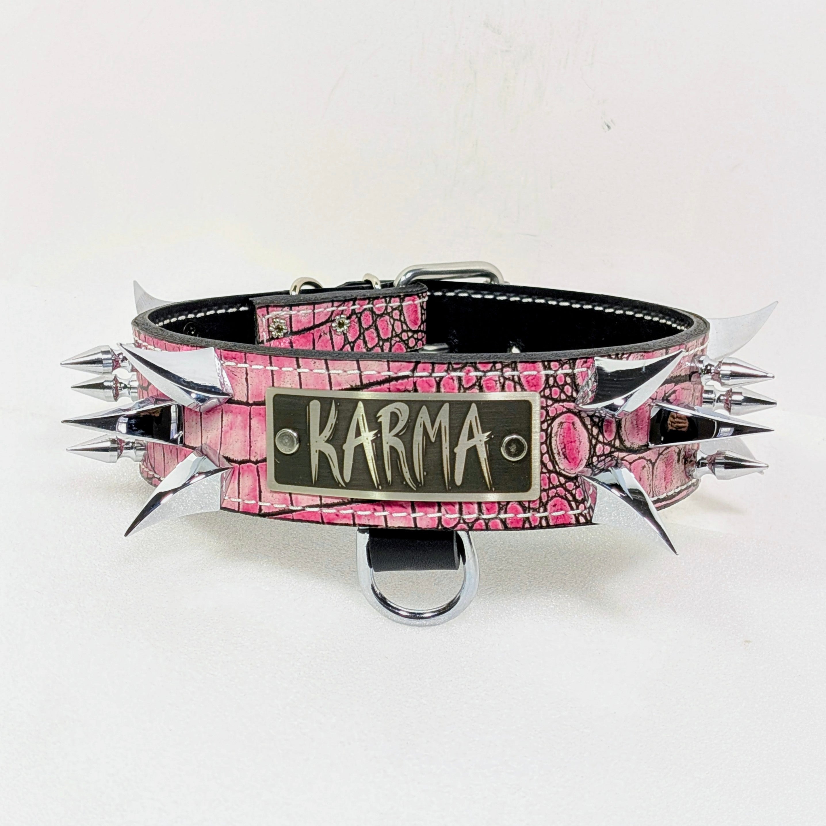 Este collar presenta una llamativa combinación de grandes púas de garra de dragón y púas de árbol de 1 pulgada. Las púas de garra de dragón colocadas meticulosamente agregan una estética audaz y feroz, mientras que las púas de árbol brindan una capa adicional de encanto resistente. Cada púa está sujeta de forma segura, lo que garantiza que permanezcan en su lugar y mantengan su apariencia llamativa con el tiempo.