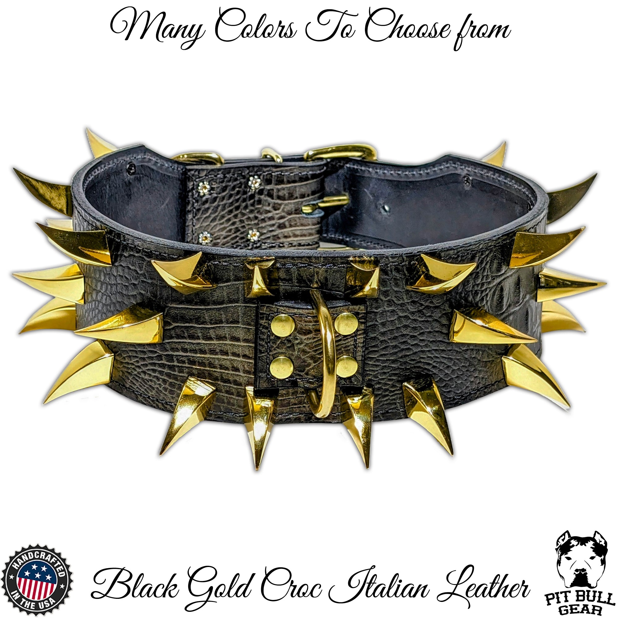 Presentamos nuestro collar de cuero para perros X24 de 3" de ancho con púas afiladas como garras de dragón, una obra maestra diseñada para los compañeros caninos más audaces. Fabricado a mano con meticulosa atención a los detalles, este collar irradia fuerza y ​​estilo, y es una declaración poderosa para su querido amigo peludo.