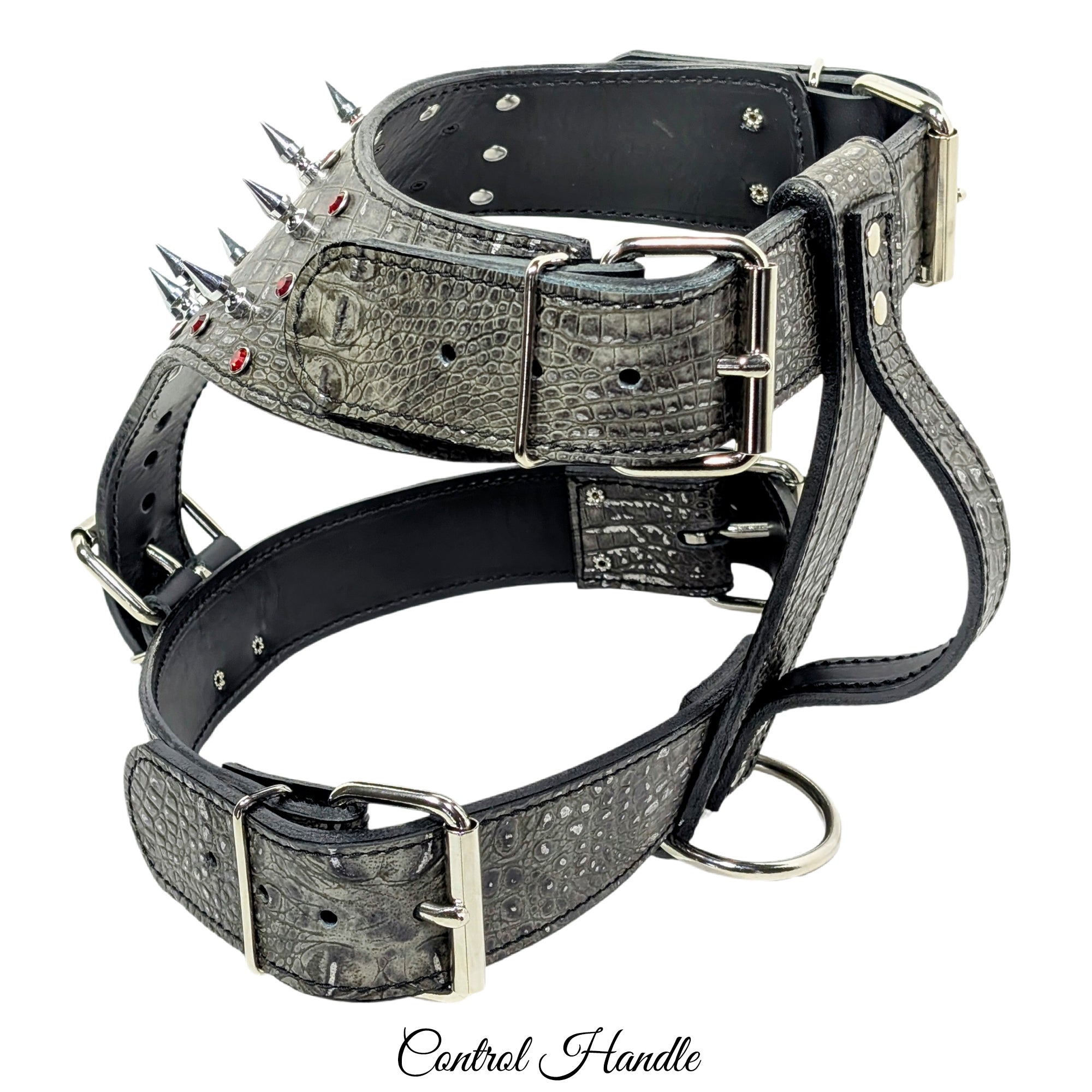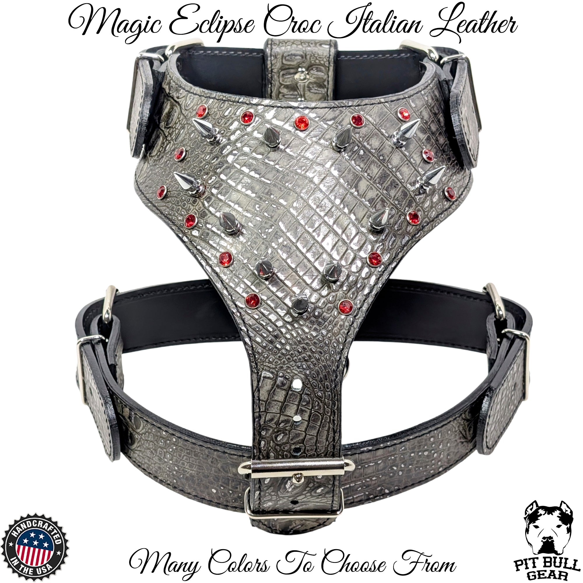 Arnés de cuero para perros con púas y gemas. Cuero y herrajes resistentes. ¡Este arnés sin duda llamará la atención! El arnés es totalmente ajustable tanto en el pecho como en el cuello.